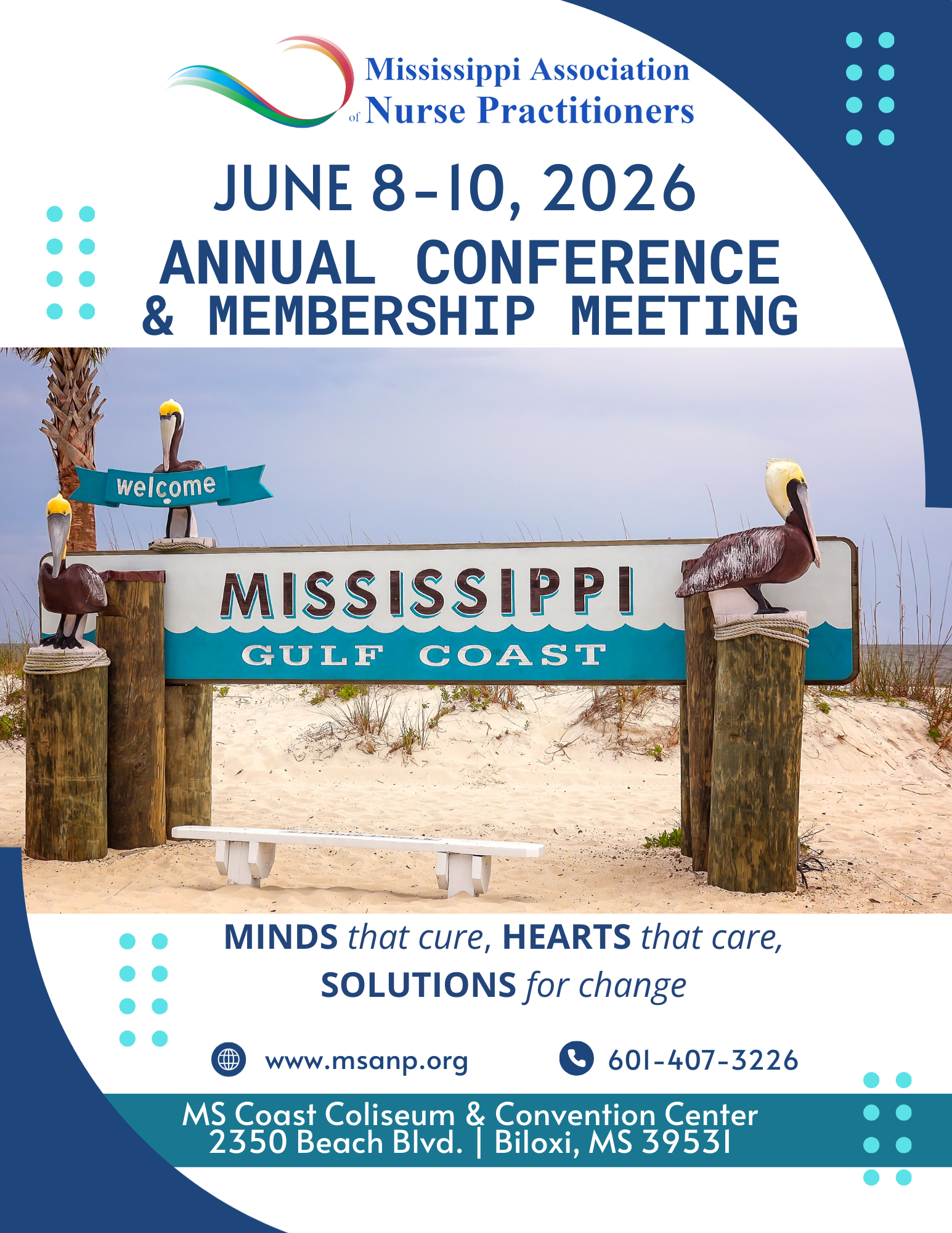 We are pleased to invite you to participate as an Attendee, Exhibitor, or Sponsor at our 2026 Annual Conference & Membership Meeting hosted by the Mississippi Association of Nurse Practitioners (MANP). We’re excited to bring our 2026 conference back to Mississippi and hope you'll join us for this impactful event. This exciting event will take place June 8–10, 2026, at the MS Coast Coliseum & Convention Center, 2350 Beach Blvd., Biloxi, MS 39531.