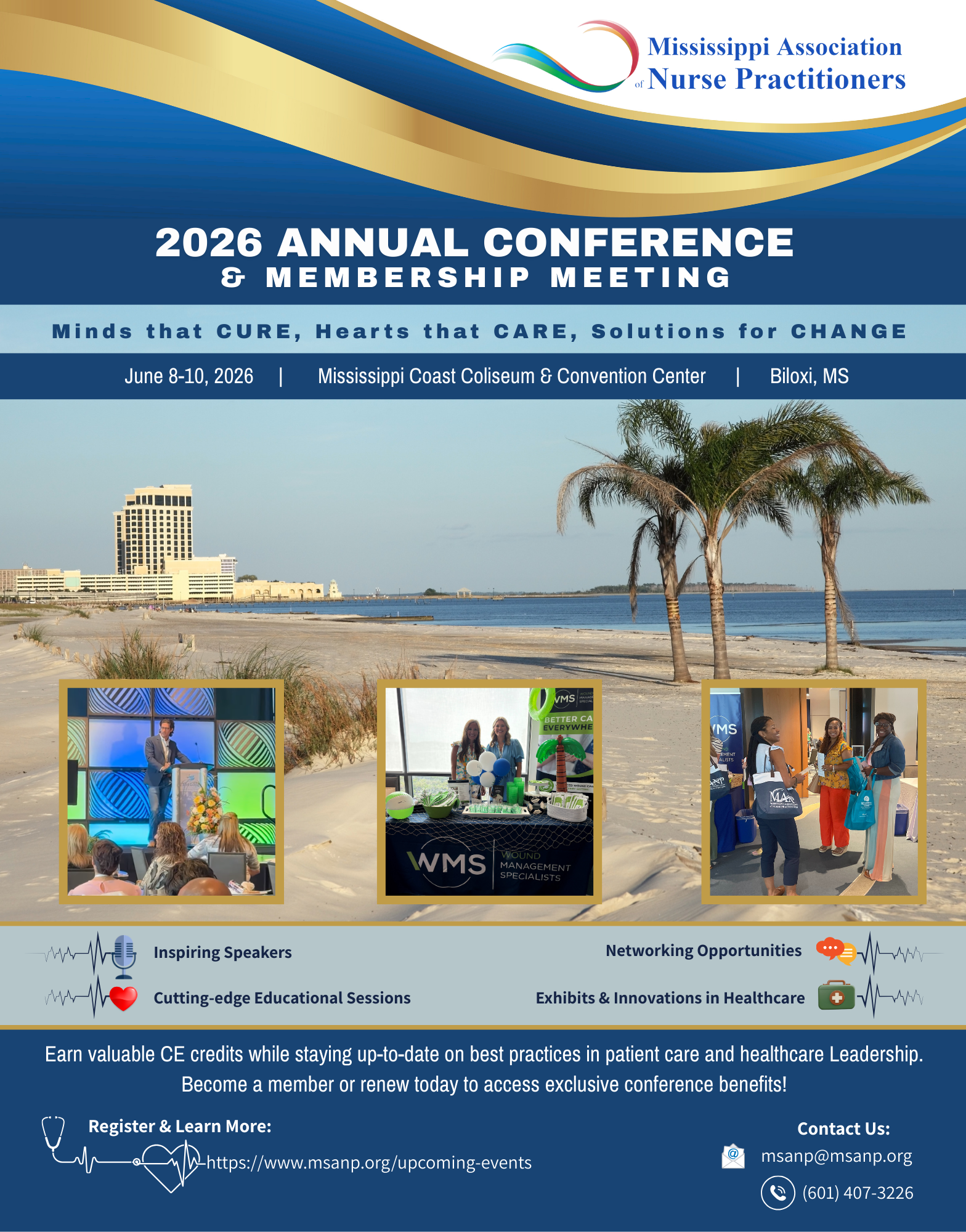 We are pleased to invite you to participate as an Attendee, Exhibitor, or Sponsor at our 2026 Annual Conference & Membership Meeting hosted by the Mississippi Association of Nurse Practitioners (MANP). We’re excited to bring our 2026 conference back to Mississippi and hope you'll join us for this impactful event. This exciting event will take place June 8–10, 2026, at the MS Coast Coliseum & Convention Center, 2350 Beach Blvd., Biloxi, MS 39531.