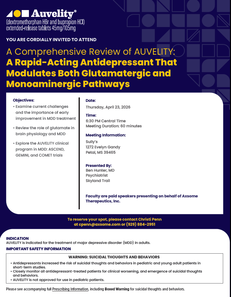 MANP is accredited by the American Association of Nurse Practitioners® as an approved provider of nurse practitioner continuing education. Provider number: 1640685. This activity is pending approval for up to 16 contact hours (s), Activity #2026-0608-0610. This activity is planned in accordance with AANP Accreditation Standards and Policies. Application for up to 7.75 Pharmacology and 5 controlled substance contact hours of the total 16 CH. Controlled Substance hours claimed by Mississippi licensed nurse practitioner participants will be uploaded to CE Broker by MANP at the completion of the evaluation process. These hours meet the 5-hour continuing education requirement related to Controlled Substances for the MS Board of Nursing.